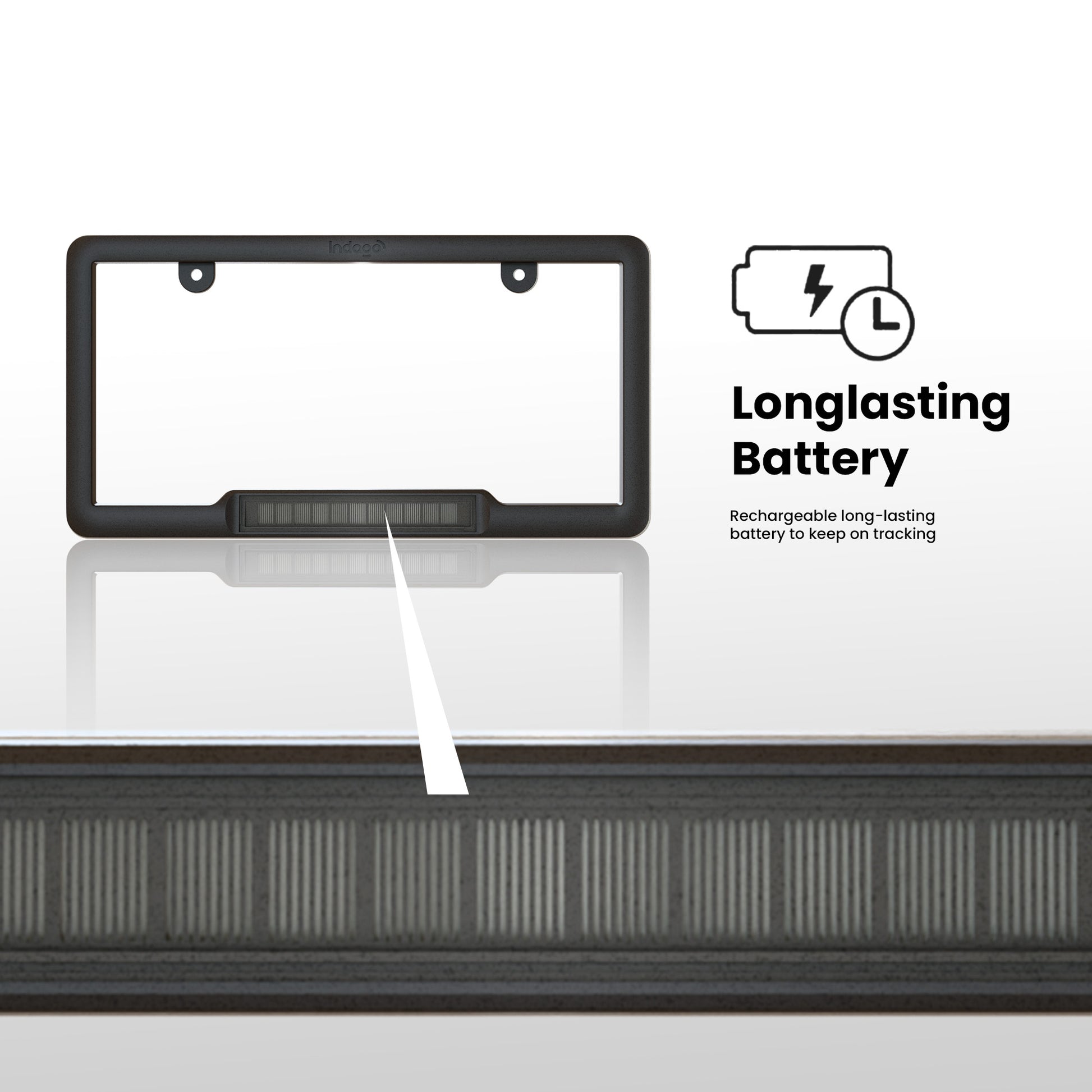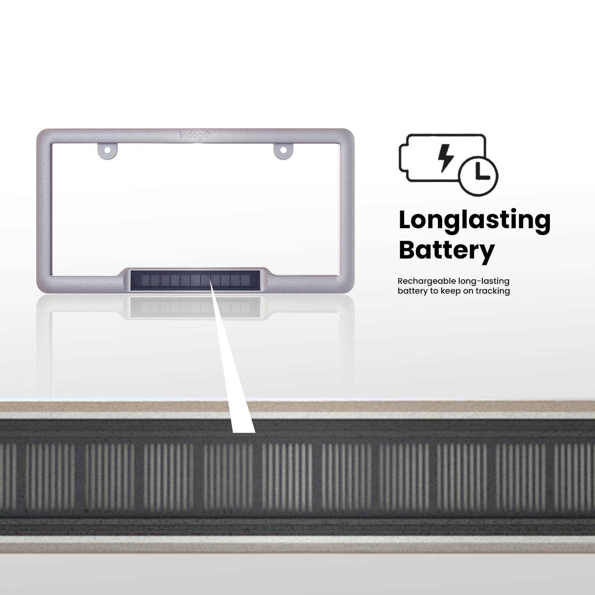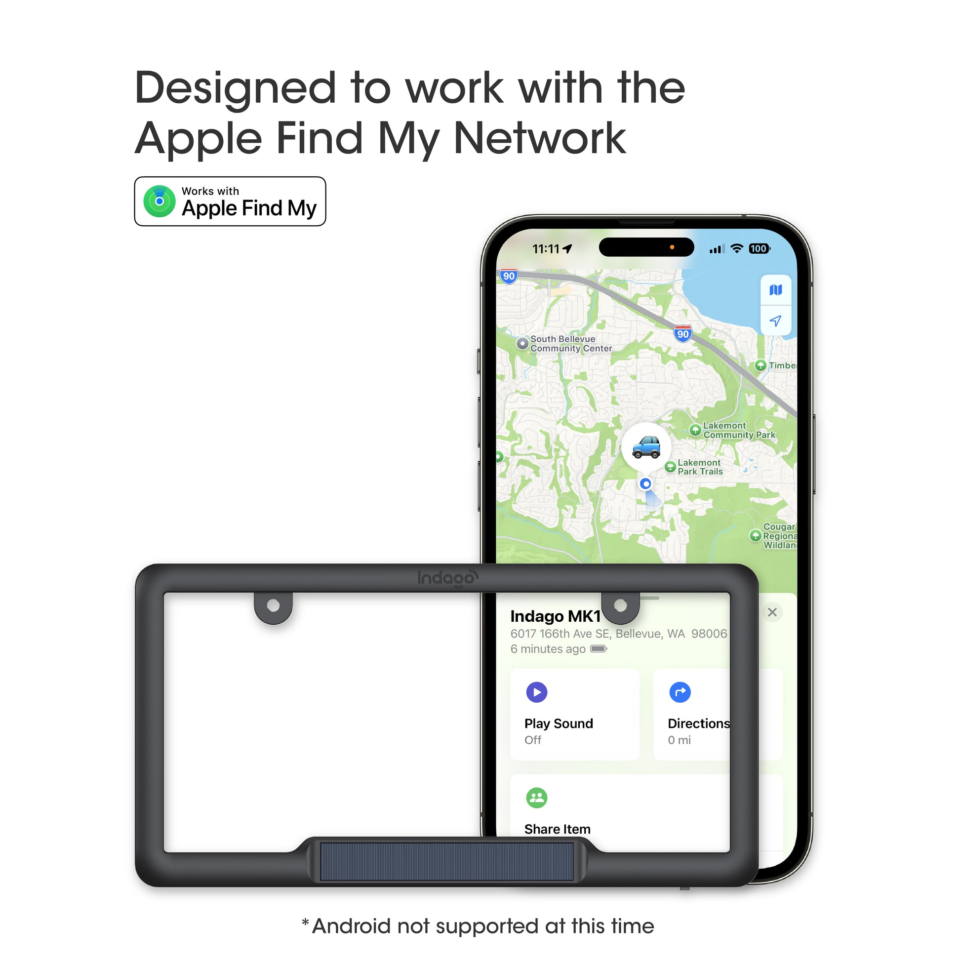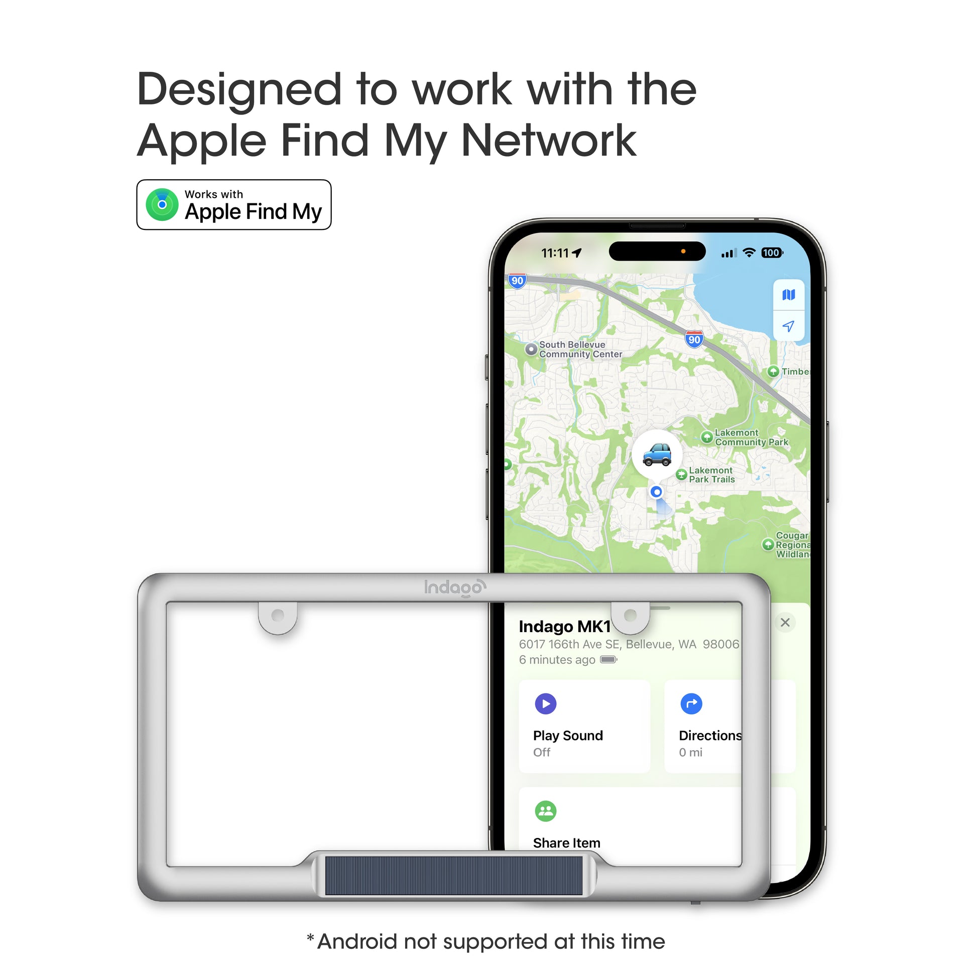 The Indago License Plate Frame is a smart device with built-in Apple Find My technology. Once paired with your iPhone, iPad, or Mac, you can track your vehicle’s location, get alerts if it moves without you, play a sound to locate it nearby, and navigate to it using Apple Maps.